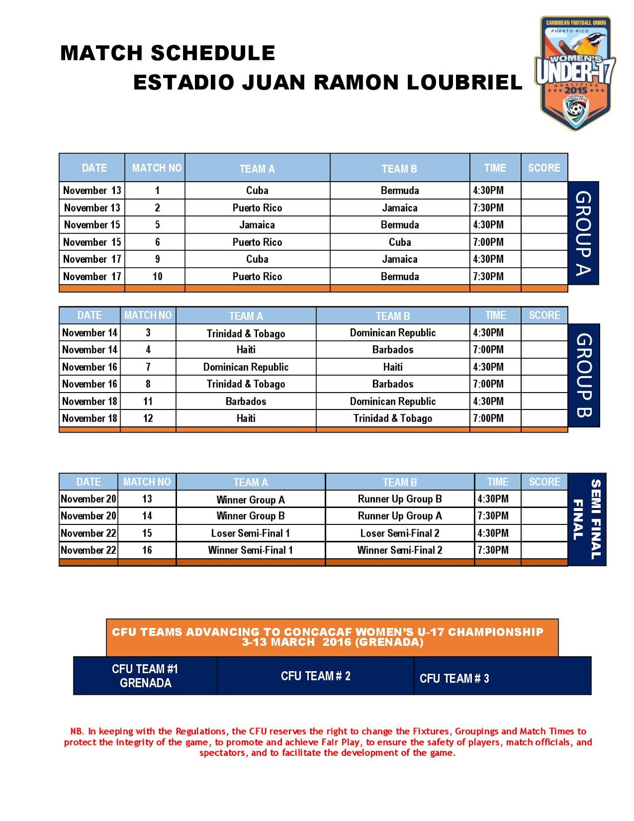 Los Partidos comenzarán el 13 de noviembre con Cuba enfrentando a Bermudas a las 4:30 pm, seguido de Puerto Rico frente a Jamaica a las 7:30 pm.