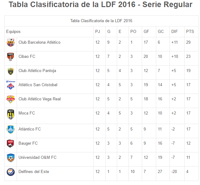 Santo Domingo,- En Vispera que pasan los dias, la Liga Dominicana de Fútbol llega a su etapa final de la serie regular donde el Club Barcelona Atlético sigue como lider de la tabla ahora con 29 puntos seguido del Cibao FC con 23 puntos, quienes buscan seguir consiguiendo puntos y terminar en la cima de la tabla. En otra parte la tan reñida 4ta posición se ha visto como el factor más importante de la liga ya que los equipos: Atlético San Cristóbal, Atlético Vega Real, Moca FC y Atlántico FC, están empatados a 17 puntos y la unica diferencia de posiciones es su Diferencia de Goles, pero esto no se queda asi y es que hasta la jornada 17 no sabriamos quien seria el 4to clasificado ya que Pantoja al perder y empatar sus ultimos 2 partidos han quedado al borde de tambien quedar fuera si no logran mantener la 3ra posición la cual tienen 19 puntos.