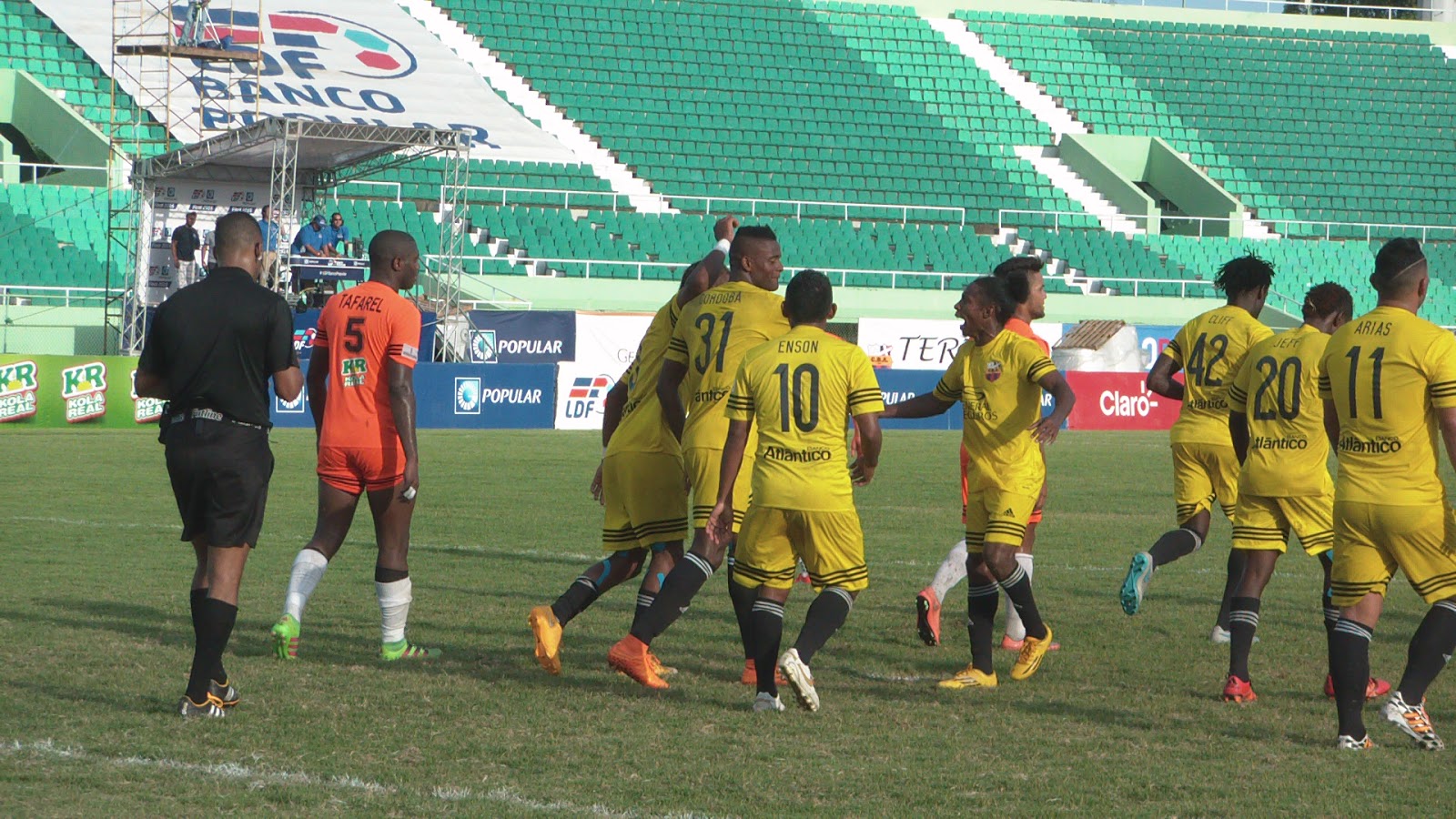 Los nuevos campeones tuvieron que venir de atrás del marcador, ya que los cibaeños picaron delante. Fue en el minuto 19 cuando el Genio del Caribe Jonathan Faña le puso número a la casa, tras un pase desde el centro del venezolano José Tafarel al delantero Domingo Peralta, quien desde el lateral derecho centró un balón a Faña que pateó desde unos 30 metros en un globo alto que voló al portero venezolano Javier Toyo, para de esa manera poner a los parciales naranja a gozar temprano.